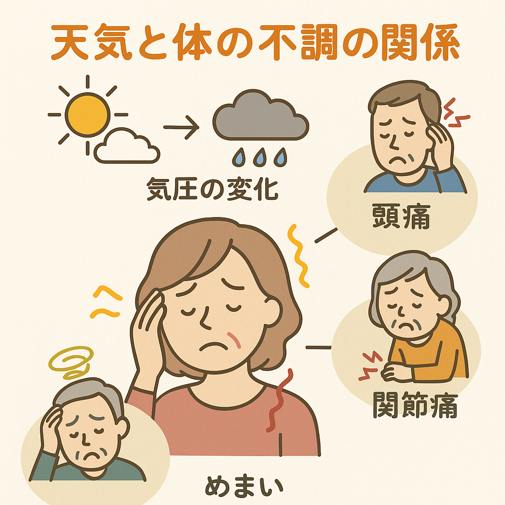 気圧が下がると体は”低酸素状態”に近づき、血管拡張して血流が変化します。その結果、頭痛・肩こり・関節痛・だるさ・めまい・眠気などの症状が現れるのです。