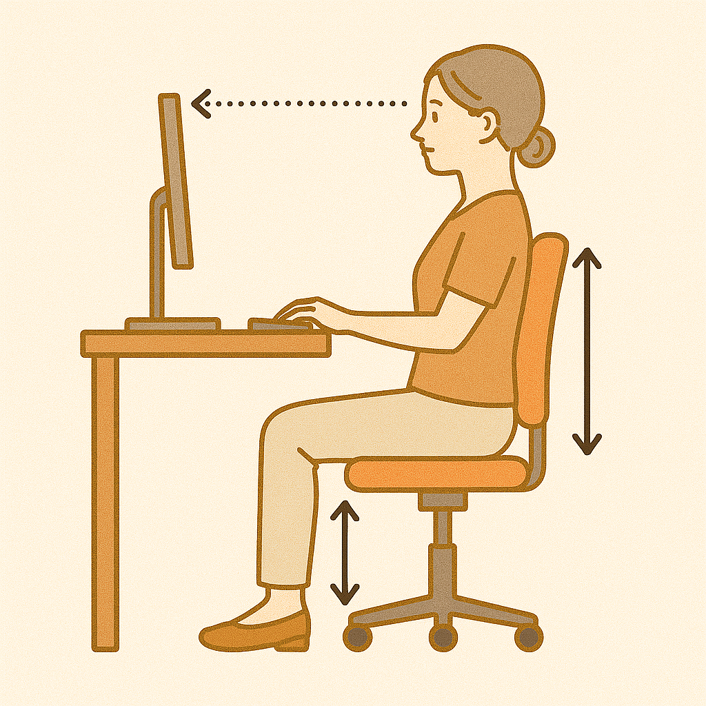 パソコン画面を目線の高さに、イスは背筋を伸ばして座れる高さに調整しましょう。