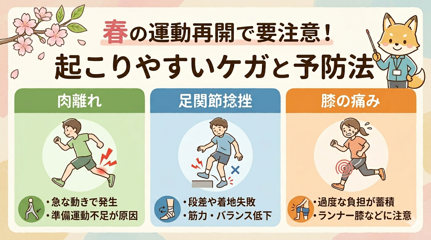 春は運動を始めるのに最適な季節ですが、同時にケガのリスクも高まります。